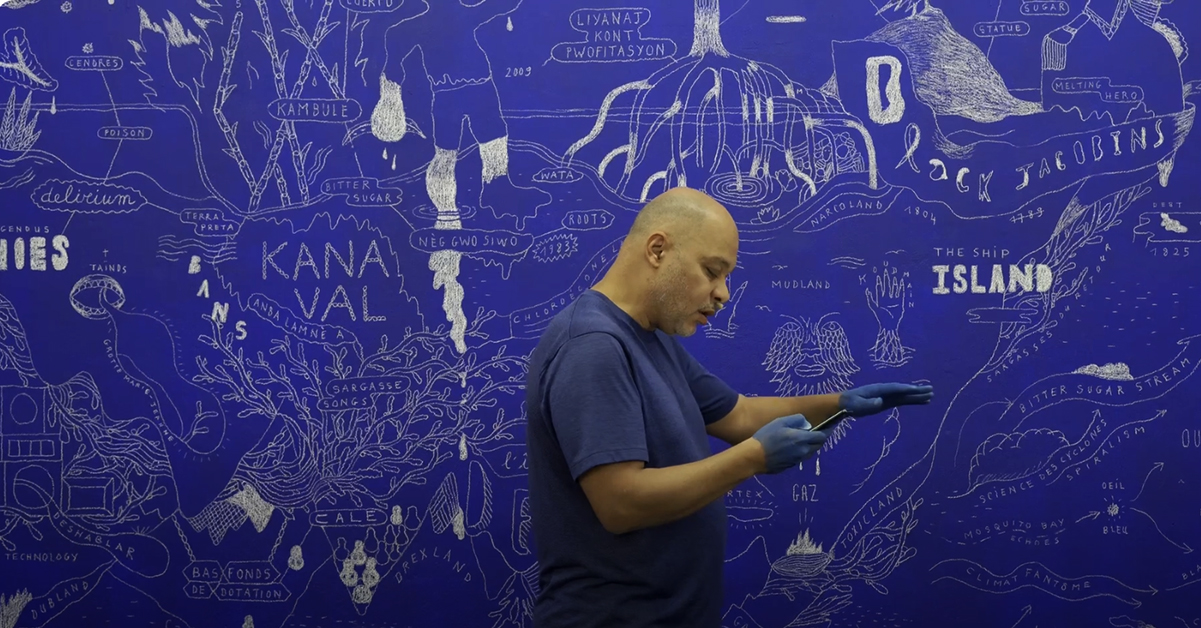 Dans le cadre de l’exposition « Eloge de la subversion (cosmogramme 2#)« , une proposition de Dénètem Touam Bona et la compagnie, lieu de création à Marseille, j’ai eu le plaisir de réalisé la fresque « L’île de la dette en retour » et de l’activer avec une lecture-performance du poème en cours « Mille sortes de bleu », le dimanche 17 novembre 2024. Un poème cartographie des liquides, un hommage à l’archive secrète et douloureuse des soeurs, des tantes et des mères, un voyage au travers de la mangrove de la mémoire et du rêve où flottent les visages familiers dans un concert d’explosions.
