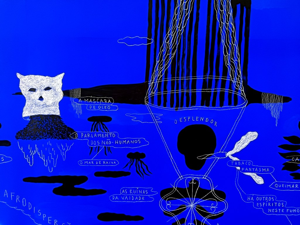 « The Round of Good Lives » is a journey that traces the stories and imaginaries of Afro-confluent cultures between Brazil and the Caribbean, leaving Europe in the distant periphery. This map imagines a territory where three black ‘islands’ (Brazil, Guadeloupe and Haiti) connect and interact in a shared history, human and non-human, visible and invisible, a monstrous history where new peoples and territories emerge from the oceans, bays and rivers to demand reparation. Taking black carnival and popular practices (Nego Fugido, Caretas de Mingau, Nèg Gwo Siwo, Lansèt Kód…) as his starting point, Olivier Marboeuf imagines another form of archive, full of cunning and masquerade, an archive of the body, sensual, fabulous, delirious, cacophonous. Far from exotic and pacifying narratives, this archive is one of colonial debt, of its violent legacies, past and present. The dates and counting of/accounting for the dead resurface in the white of sugar covering the blue of indigo and the grimacing masks of Black memory. With The Round of Good Lives, Olivier Marboeuf writes a new chapter in his graphic and sound manifesto in a world burning with the flames of capitalist vanity. After a research residency in the Bahia region and São Paulo, the artist presents a new sound piece that combines stories and songs collected in the Caribbean with Brazilian voices and ghosts. From the Carandiru prison to the call of the Caretas de Mingau and the struggles of Black women for emancipation through theatre, all these rebellious voices shake the walls to demand justice, dignity and sovereignty for good lives, free of debt.